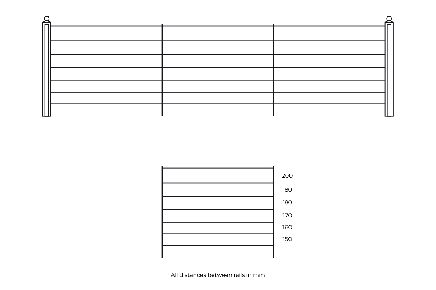 Our Stock Fencing stands at 1.2 metres high with 7 rails, making it our most popular fencing option. Designed to be attractive, strong, and highly functional, it ensures that children, dogs, livestock, and horses remain safely contained. The bottom rails are spaced closely together, offering excellent security for smaller animals and pets.